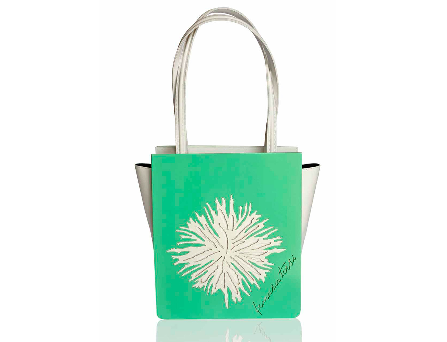 Shopper in Tiffany’s green wood and white  leather with double fixed handle white.