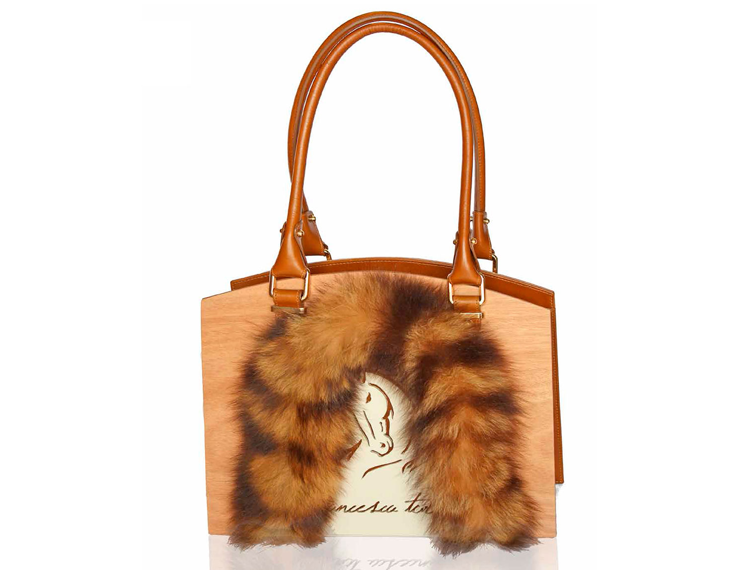 Shopper in natural and ivory wood and, leather leathern with double fixed handle.