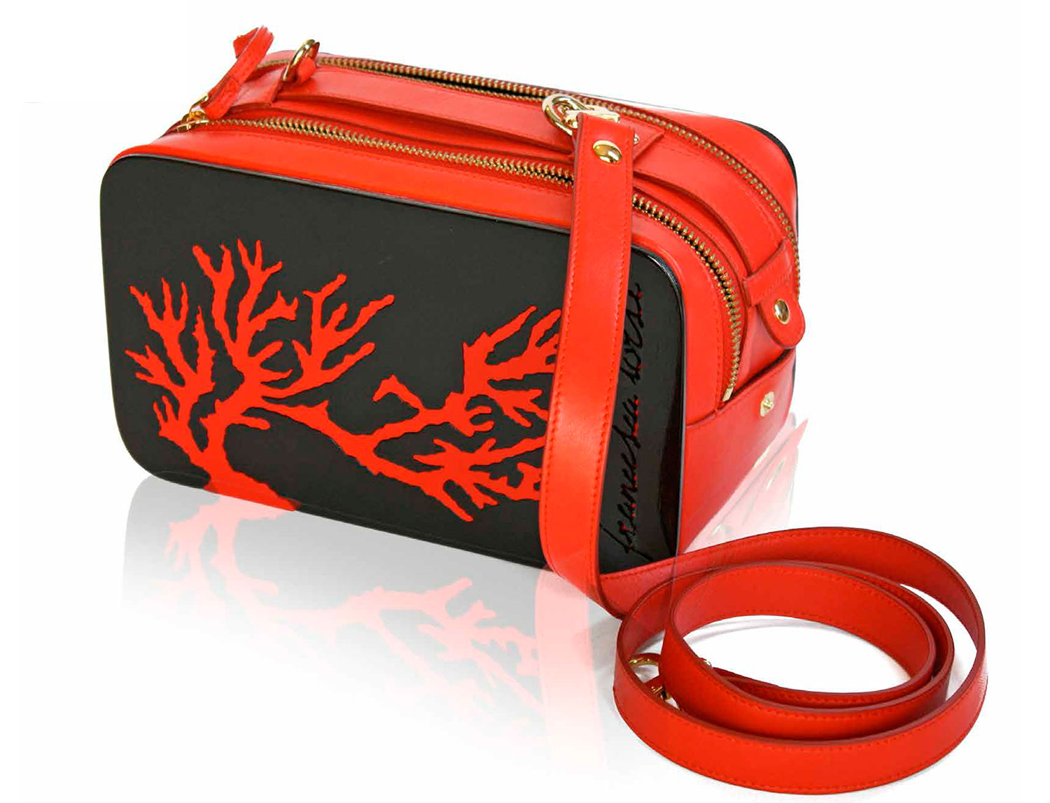 Fretwork in contrasting red depicting a coral branch. Central opening with double zipper. It equipped with mobile phone holder, key clip inside.