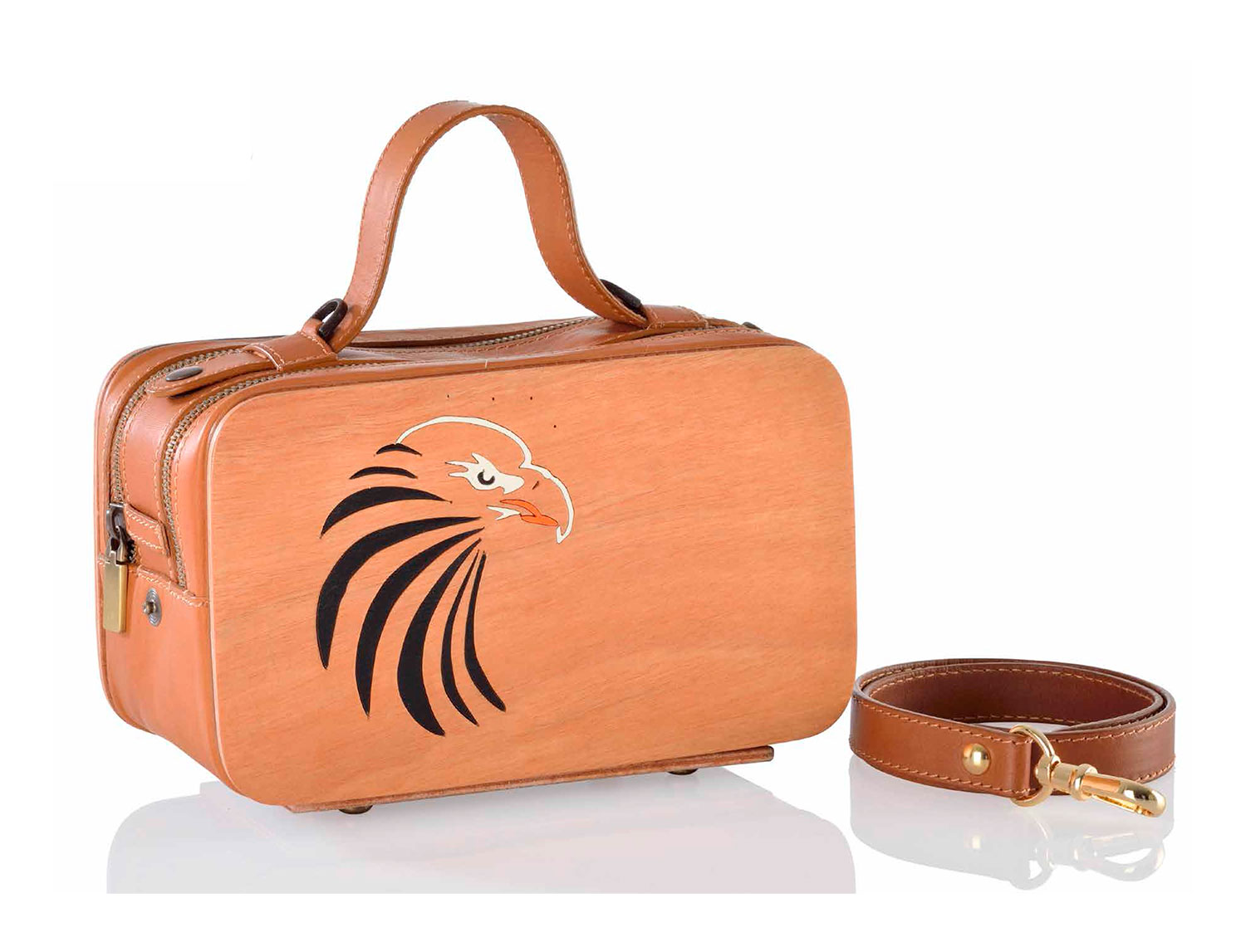 Mini Bag in natural wood and leathern leather. With handle leathern leather retractable and removable shoulder strap. Fretwork in contrasting black, white and orange depicting a head of eagle. Central opening with double zipper. It equipped with mobile phone holder, key clip inside. Zipper and accessories gold .