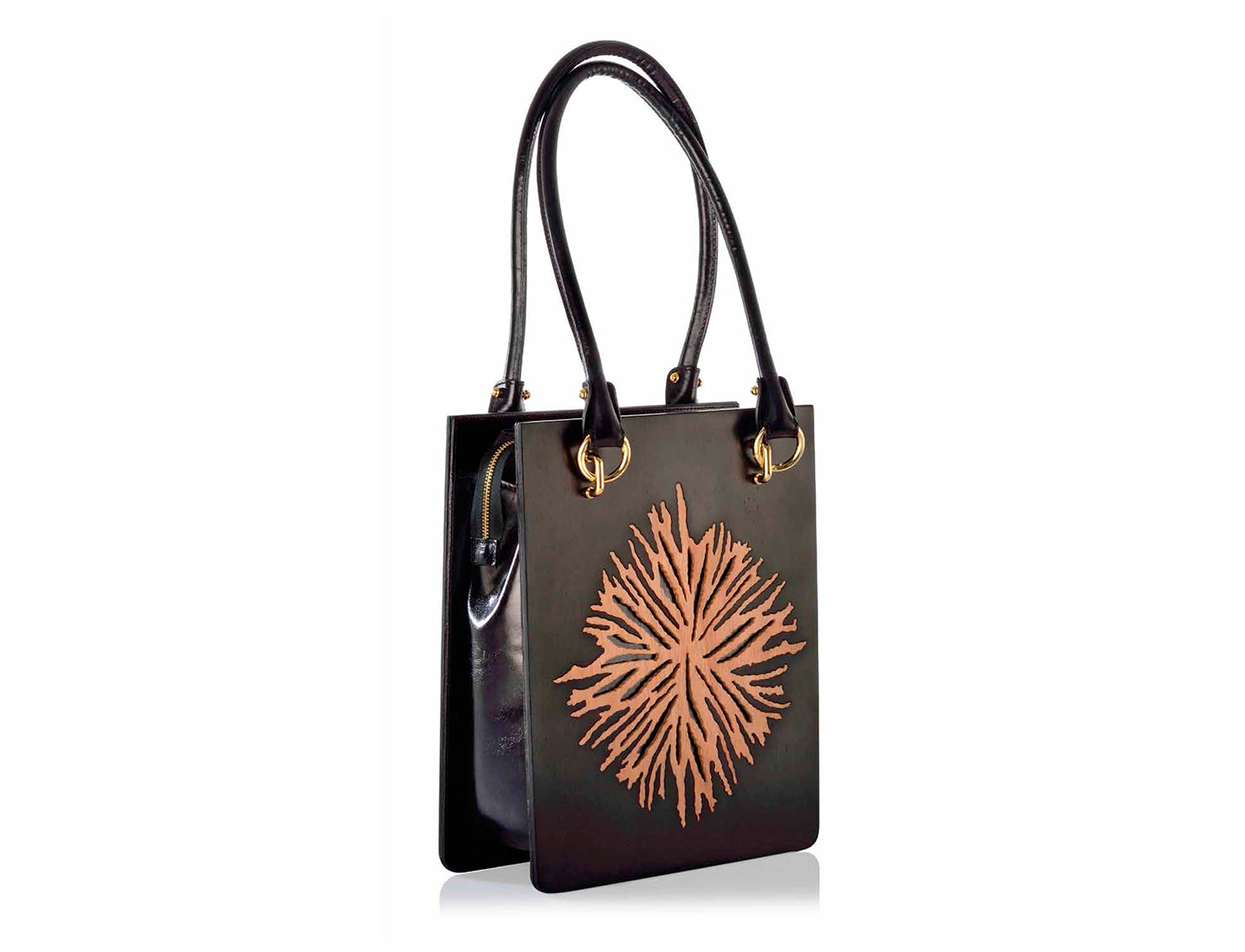 Shopper in legno nero opaco e pelle nera con doppio manico removibile.