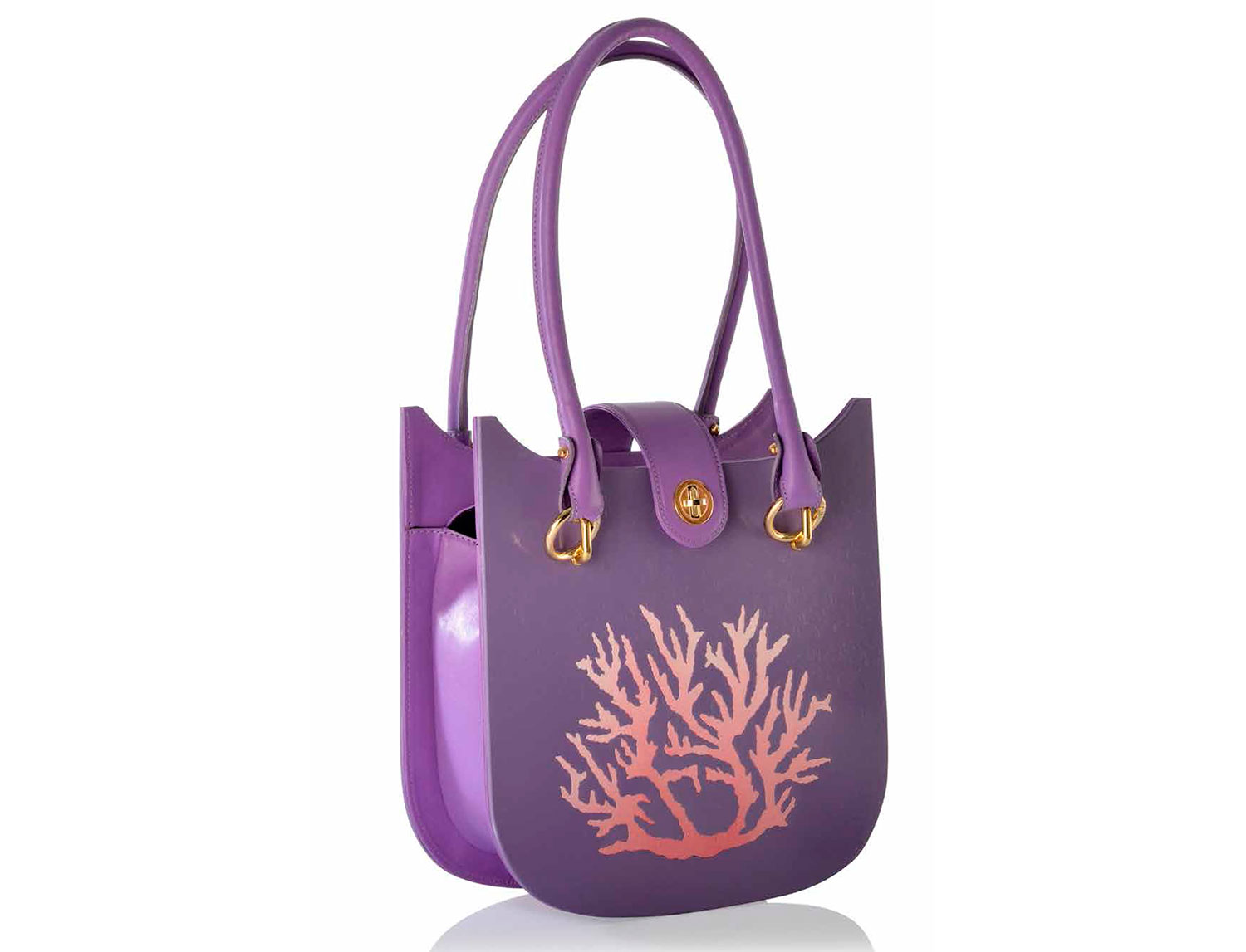 Shopper in legno e pelle glicine con doppio manico removibile.
