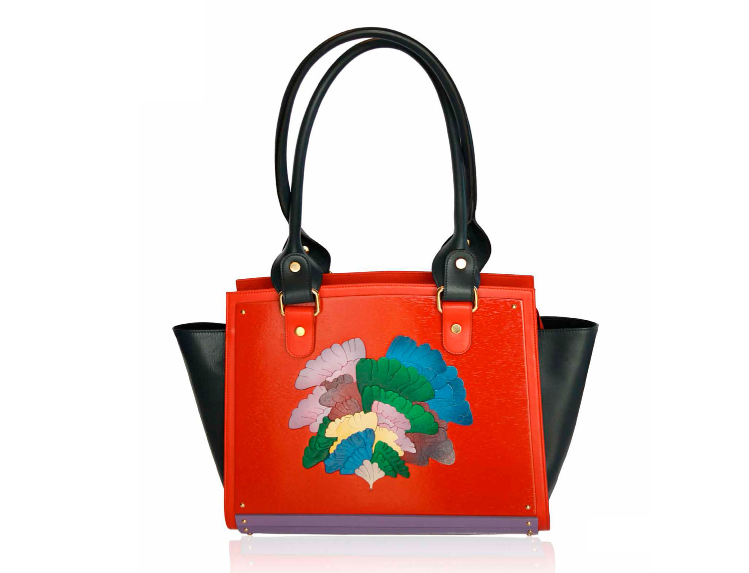 Borsa shopper in legno glicine e rosso e pelle blue navy e rosso con doppio manico fisso.