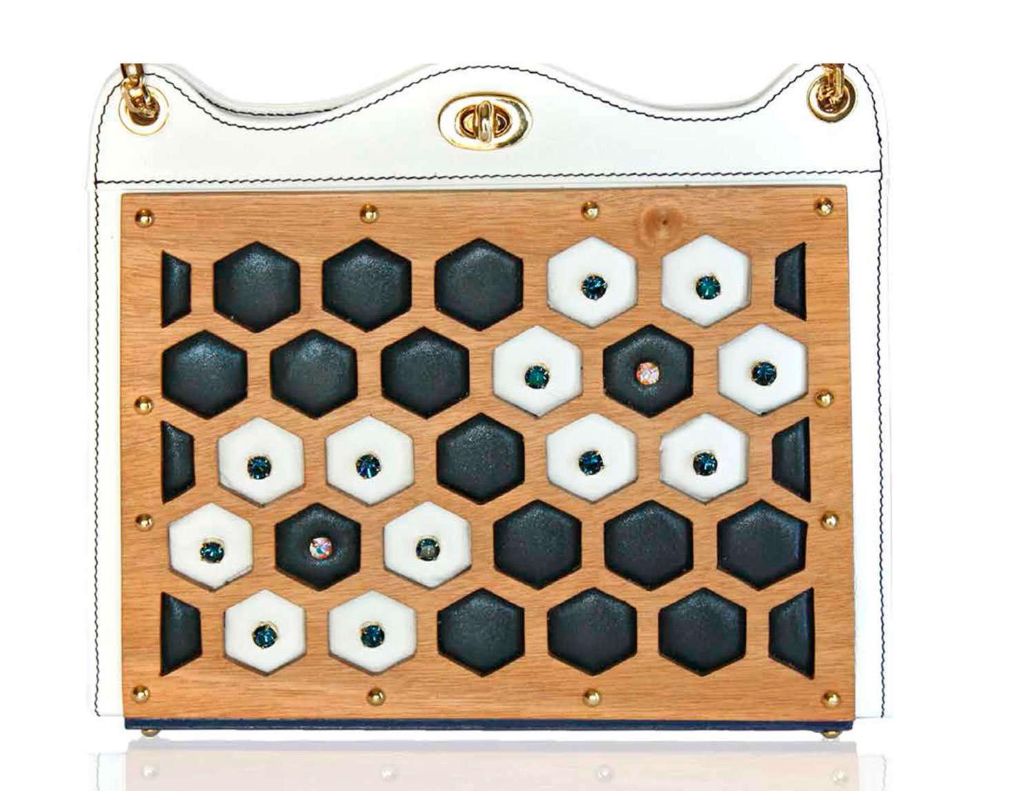 Pochette in legno naturale e pelle bianca. Traforo a nido d’ape in legno naturale con inserti in raso laminato blue marine ed in pelle bianca a contrasto a formare fantasia floreale impreziosita da cristalli Swarovski di Swarovski Elements e da borchie di colore oro.